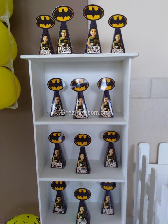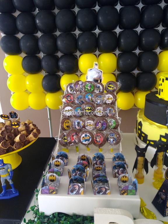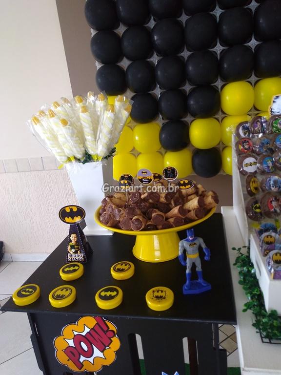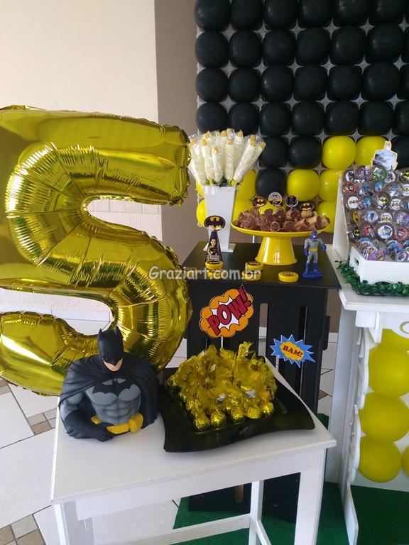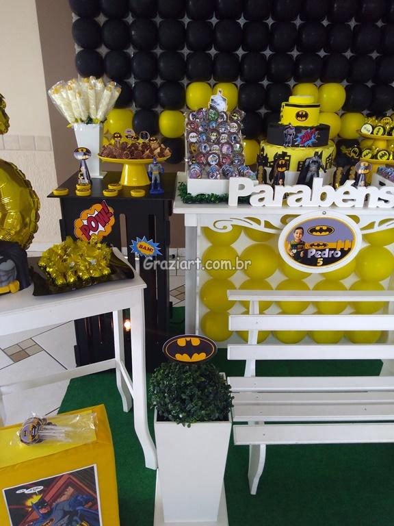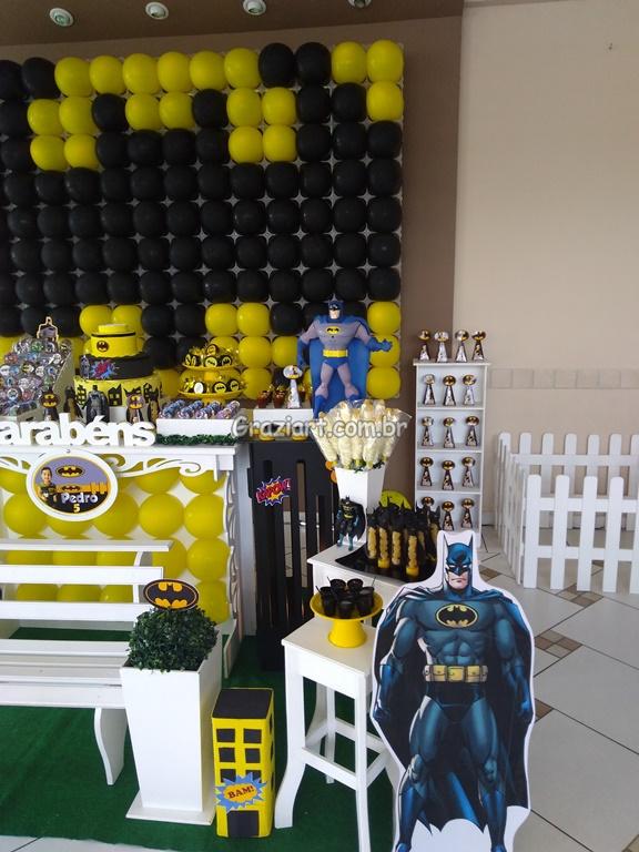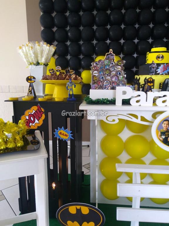 O Super Herói das histórias em quadrinhos agora está na sua festa, decoração com cores fortes mas com muito estilo, bolo cenográfico com tema e representando algumas imagens do desenho, bonecos do personagem Batman plaquinhas do símbolo do Batman, Painel de Bexigas também temático, cubos iluminados que dão um toque especial a decoração. Os meninos vão adorar.