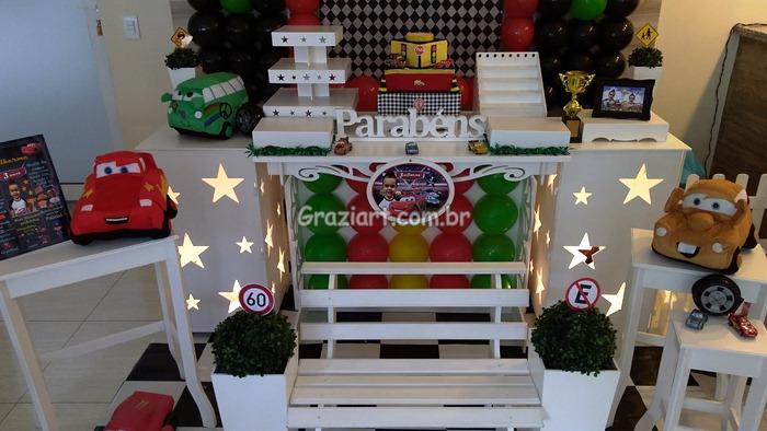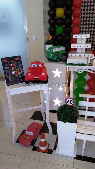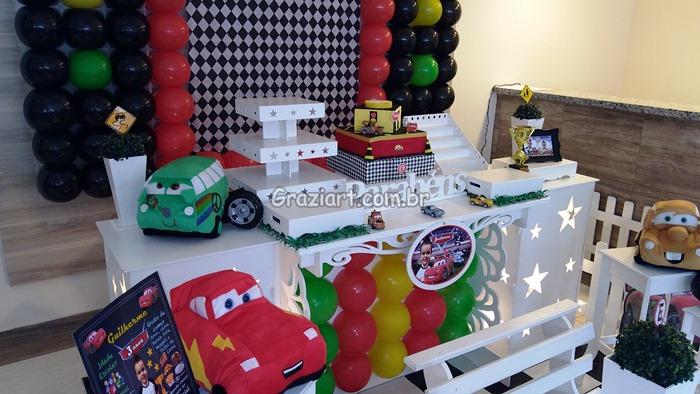 Decoração elaborada para meninos que são loucos por carros, inspirado no tema do filme Carros da Disney, onde carros de corrida são preparados para concorrer a grande prova da Copa Pistão, Bolo cenográfico no tema dos carros, painel de bexigas imitando faróis de transito, troféu também faz parte da decoração, cubos iluminados , cone de sinalização e claro carrinhos ,produzido nas cores vermelho, branco, preto e amarelo, uma decoração alegre e sofisticada para o dia especial.