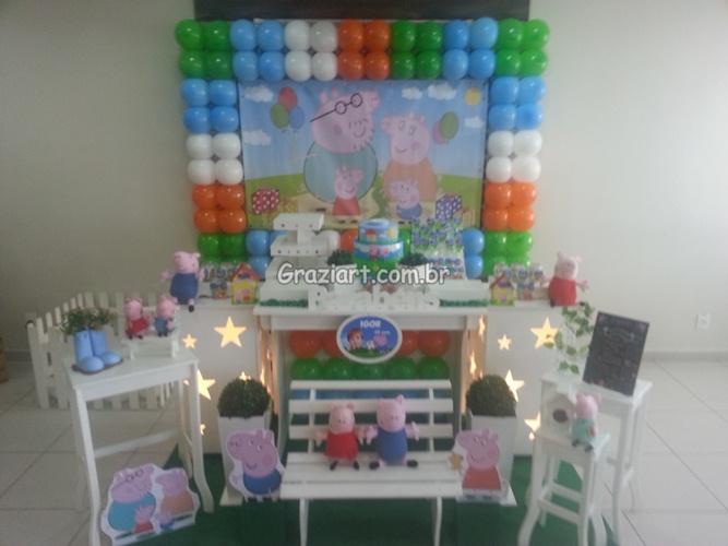 Uma decoração provençal, elaborada com um tema de personagens de desenhos infantis, Peppa  Pig  que estão fazendo a cabeça da criançada, o bolo cenográfico confeccionado com os personagens Peppa Pig e George toda a decoração, foi criada para que o aniversariante se sinta dentro de um desenho junto com seus personagens preferidos .Com um painel de bexigas colorido e divertido.Podendo ser criado vários tipos de painéis dentro do tema Peppa Pig
