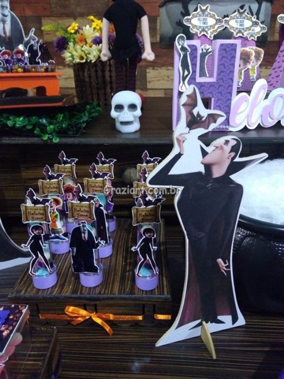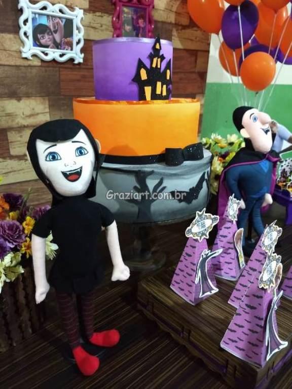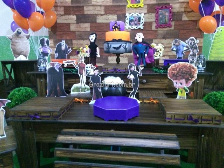 Em um Hotel de luxo, onde monstros e fantasmas são seus hóspedes, comandado pelo Conde Drácula, aprontam muitas travessuras, com personagens inusitados e engraçados, onde convivem monstros e humanos em uma grande aventura, Decoração desenvolvida, a partir de cores personagens, e acessórios do tema, dando um toque de realidade a sua festa.