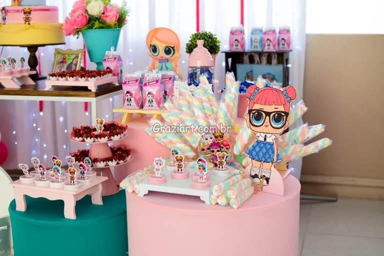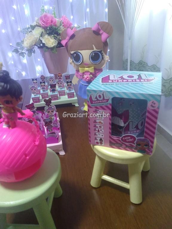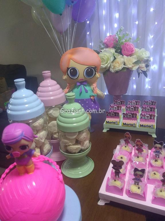 Uma mini Boneca que vem dentro de uma bola plástica, com mini acessórios, as meninas enlouqueceram com elas, um tema delicado especialmente desenvolvido pra meninas, com papelaria personalizada e lembrancinhas que enchem os olhos, de tanta beleza, Tema desenvolvido pela Grazi art , com muito carinho e dedicação, fugindo um pouco do convencional banner como fundo da decoração, substituído por cortinas brancas de Led e personagens.